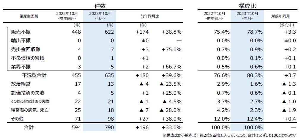 主因別にみると、「販売不振」が622件(前年同月448件、38.8%増)で最も多く、全体の78.7%(対前年同月3.3ポイント増)を占めた。内訳を業種別にみると、「小売業」(前年同月111件→139件)が最も多く、「サービス業」(同99件→137件)が続いた。「売掛金回収難」(同4件→7件、75.0%増)などを含めた『不況型倒産』の合計は635件(同455件、39.6%増)となった。9カ月連続で前年同月を100件以上上回ったのは、2000年以降で初めて。