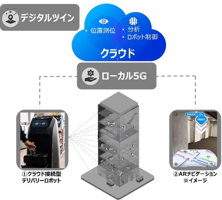 ロボットがデジタルツイン等を活用して自立的に動作する「クラウドロボティクス」の実装に向けて、従来のように個々のロボットで頭脳を持つのではなく、クラウド上で移動制御等を行う「クラウド接続型デリバリーロボット(以下、「デリバリーロボット」)」を導入します。デリバリーロボットはクラウド上のデジタルツインを地図として用い、VPSによる位置測位を行うことで、自身の現在地を正確かつリアルタイムに把握するとともに、デジタルツインが更新された際には即時に全てのデリバリーロボットの経路に反映することが出来ます。また、互いの位置を把握した上での移動制御も可能であり、建物内において100台規模のデリバリーロボットを集中制御・管理できます。その際、ロボットはクラウドとの間で高精細な画像をリアルタイムに伝送しながら広範囲なエリアを移動する必要があるため、高品質な無線アクセスであるローカル5G環境は非常に有効であり、シームレスな移動を実現できます。