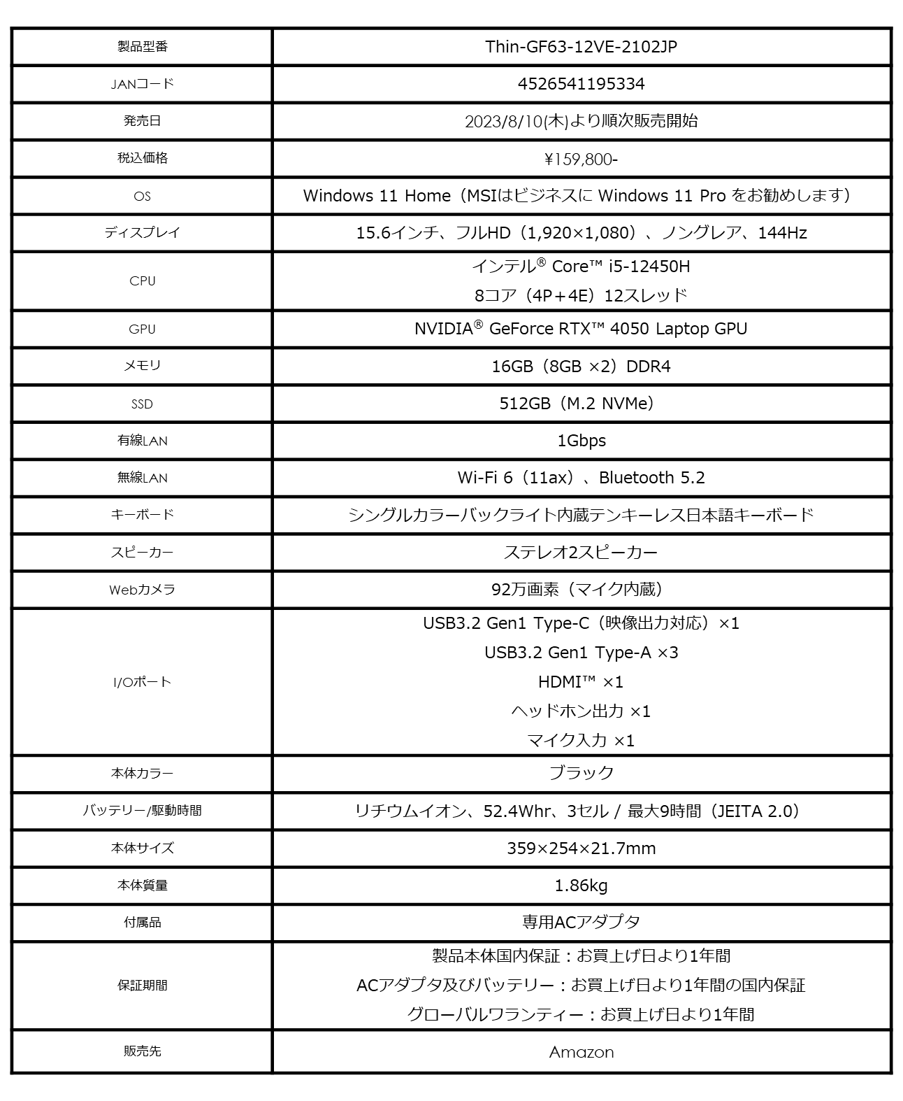 ・Thin GF63 12V シリーズ製品ページ:https://jp.msi.com/Laptop/Thin-GF63-12VX