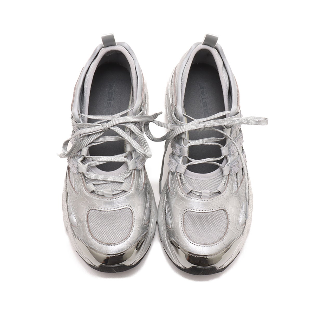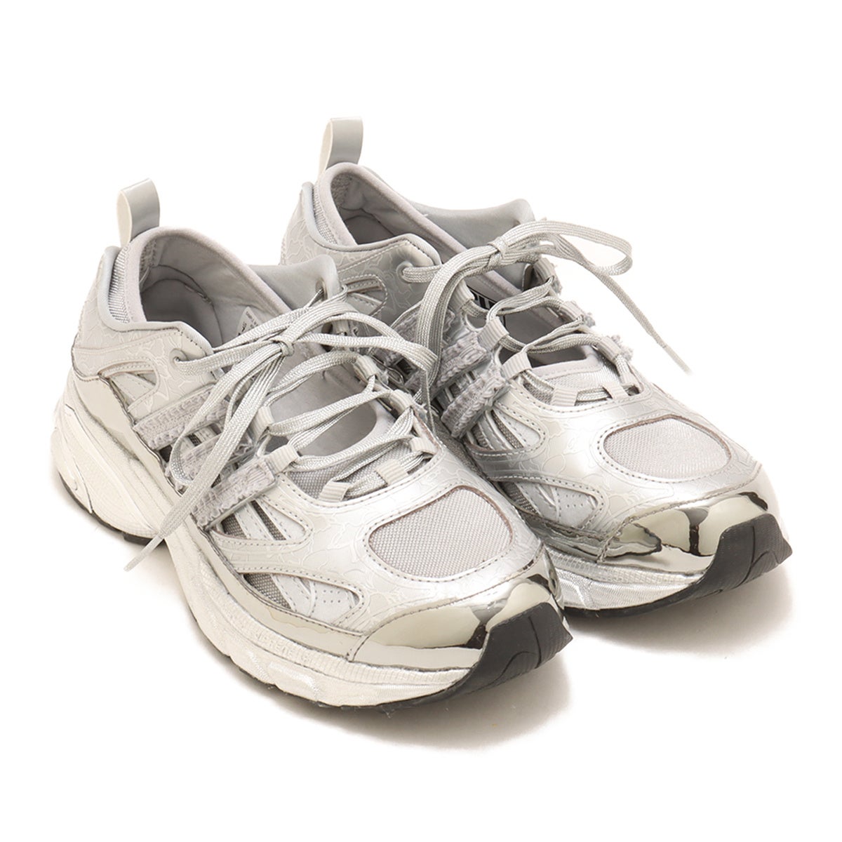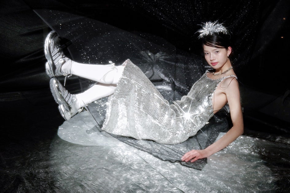 ”Silver Veil(シルバー ヴェール)“と称した今作は、その名の通りトレンドのシルバーカラーを踏襲した新作モデル。透かしのライナーと花柄を模したアッパーが、まるで軽やかさと華やかさを与えるヴェールを纏っているようなデザインで足元からフェミニンな印象を与える。