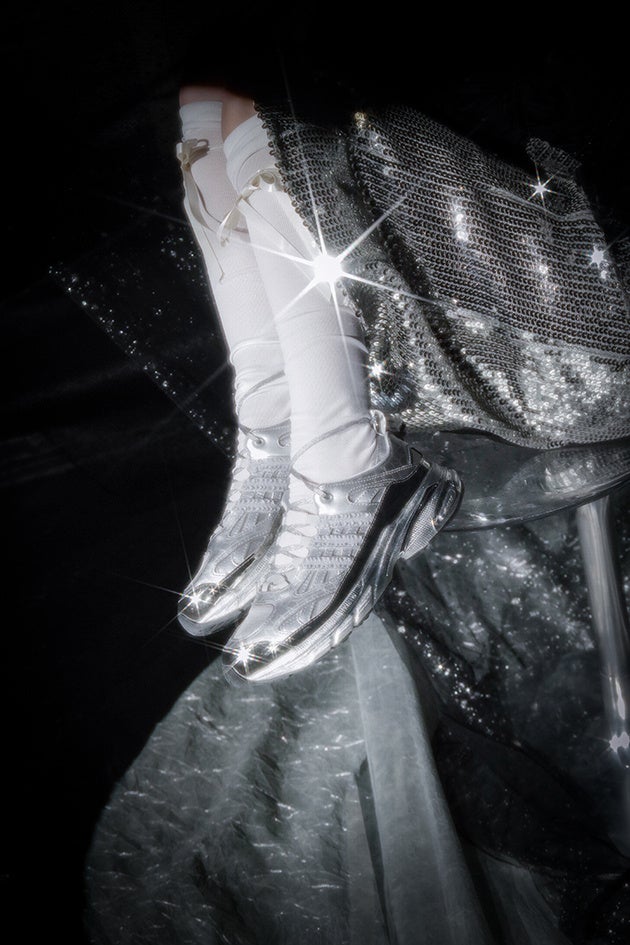 またバレエからインスピレーションを得ている本モデルは、シュータンを取り除き伸縮メッシュを使用したソックス構造になっており、レトロランニングスニーカーADISTAR POSEのアッパーデザインをソックス上部のオープンケージ構造に変更。シューレースを足首に結ぶアレンジでバレエシューズの雰囲気も愉しめます。