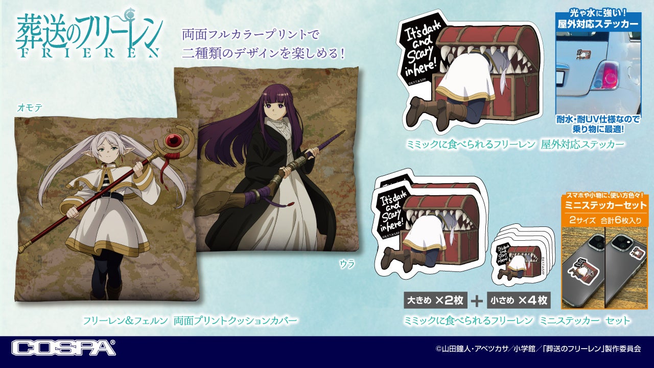 フリーレン展先行決定!『葬送のフリーレン』ミミックに食べられるフリーレンのステッカー、「フリーレン&フェルン」のクッションカバーが登場!【株式会社コスパ】