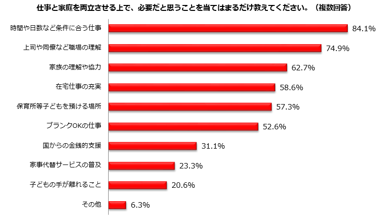 また「仕事と家庭を両立させる上で、必要だと思うことを当てはまるだけ教えてください」と尋ねたところ、最も多かったのは「時間や日数など条件に合う仕事」で84.1%。次いで「上司や同僚など職場の理解」74.9%、「家族の理解や協力」62.7%、「在宅仕事の充実」58.6%、「保育所等子どもを預ける場所」57.3%、「ブランクOKの仕事」52.6%と続き5割を超えています。これらは個々に異なる性質の課題であり、仕事と家庭の両立には、これらのうちのどれか一つではなく総合的な解決が求められます。中でも最大の課題は、8割以上が指摘する「時間や日数など条件に合う仕事」の創出です。政府が進める働き方改革、女性活躍支援、一億総活躍などの施策において、条件に合う仕事を如何に世の中に増やしていけるかこそが、仕事と家庭の両立を実現させる上で軸となるのだと考えます。