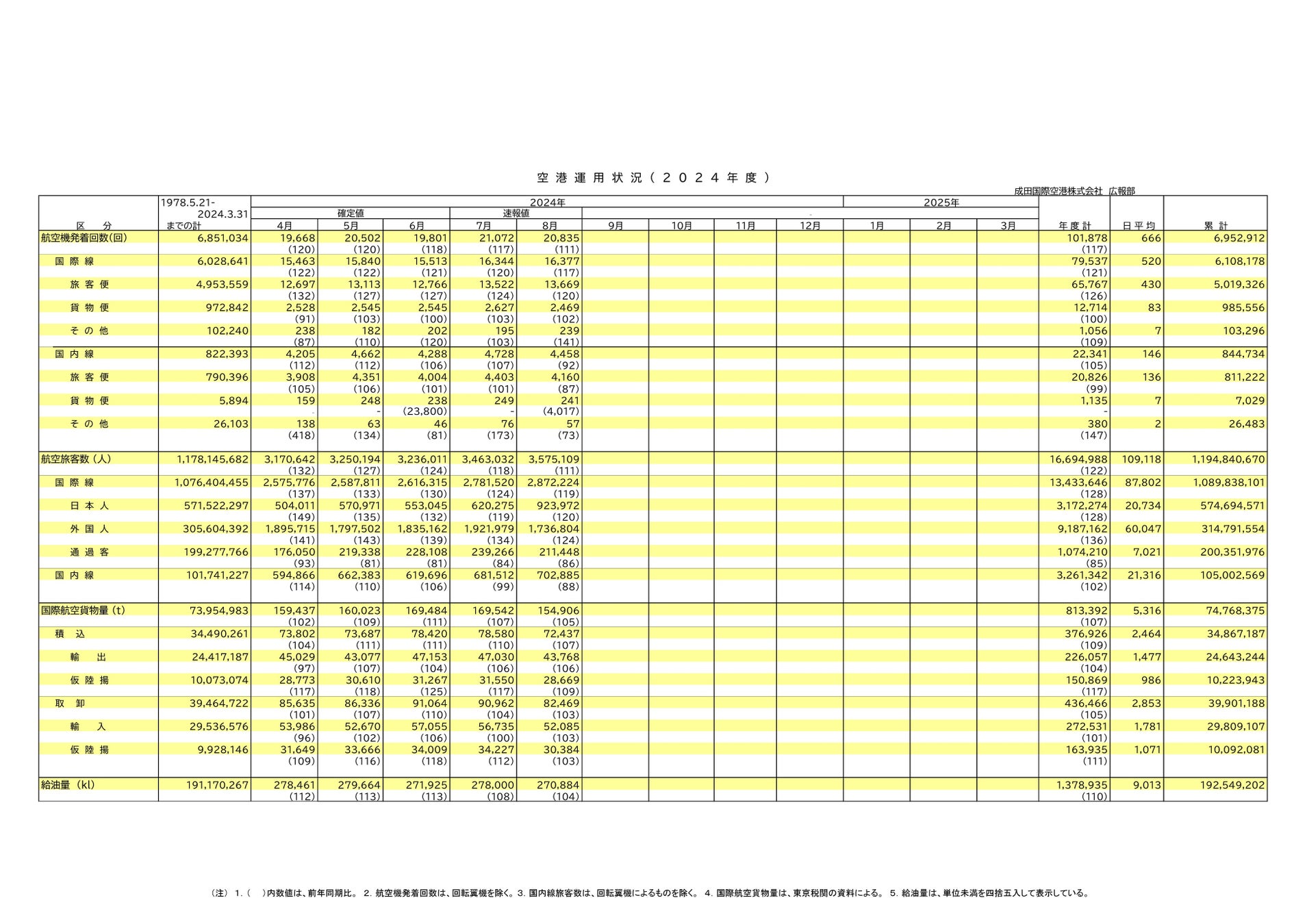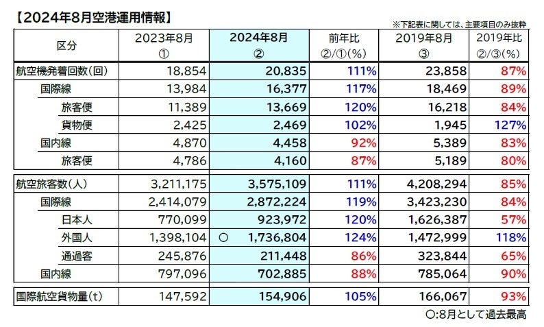 2024年8月 空港運用状況 国際線外国人旅客数が8月として最高の173万人