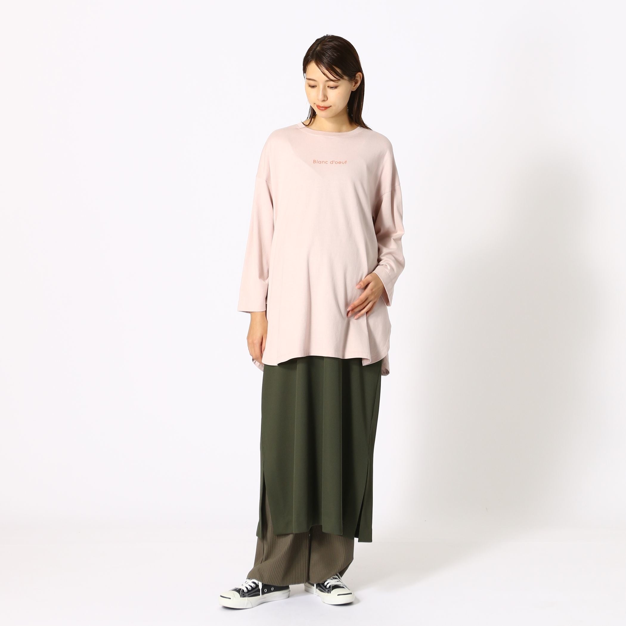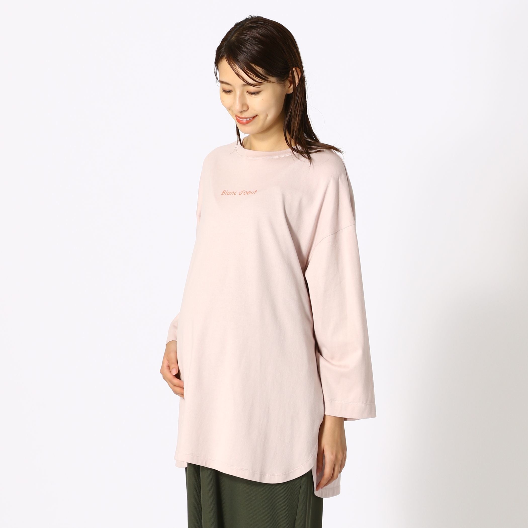 ゆったりとしたサイズ感で産前も産後も大活躍!コムサ・ブロンドオフのブランドロゴプリント入り長袖Tシャツ