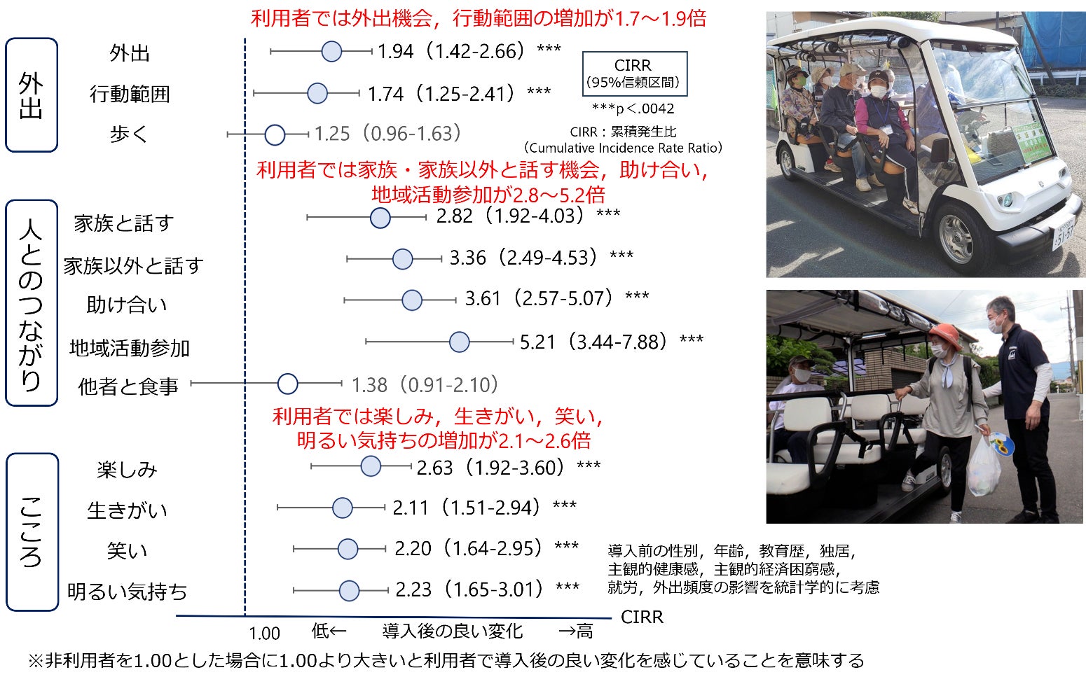 電動カート利用者は、非利用者と比較して、外出、こころ、人とのつながりにおいて約1.7-5.2倍の良い変化を感じていることがわかりました。このことから、電動カートは外出、こころ、人とのつながりに良い変化をもたらす“動く交流の場“のような機能をもち、移動支援に留まらない地域の課題を解決する可能性が示されました。今後、電動カート運行の継続、対象者の長期追跡により、電動カート利用による要介護リスク、社会保障費用抑制についての検証も必要となると考えられます。