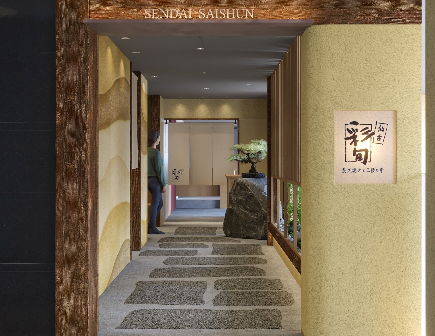 2008年2月、アパホテル〈仙台駅五橋〉と同時にオープン以来17年間、「和食・割烹 彩旬」として営業を行ってきたが、今般のフルリニューアルを機に、宮城県をはじめとする東北の食にこだわり、店舗中央に配した焼き台カウンターで地物の炭火焼きやご当地料理などを常時10種類以上の東北地酒とともに愉しめる店舗へと生まれ変わる。