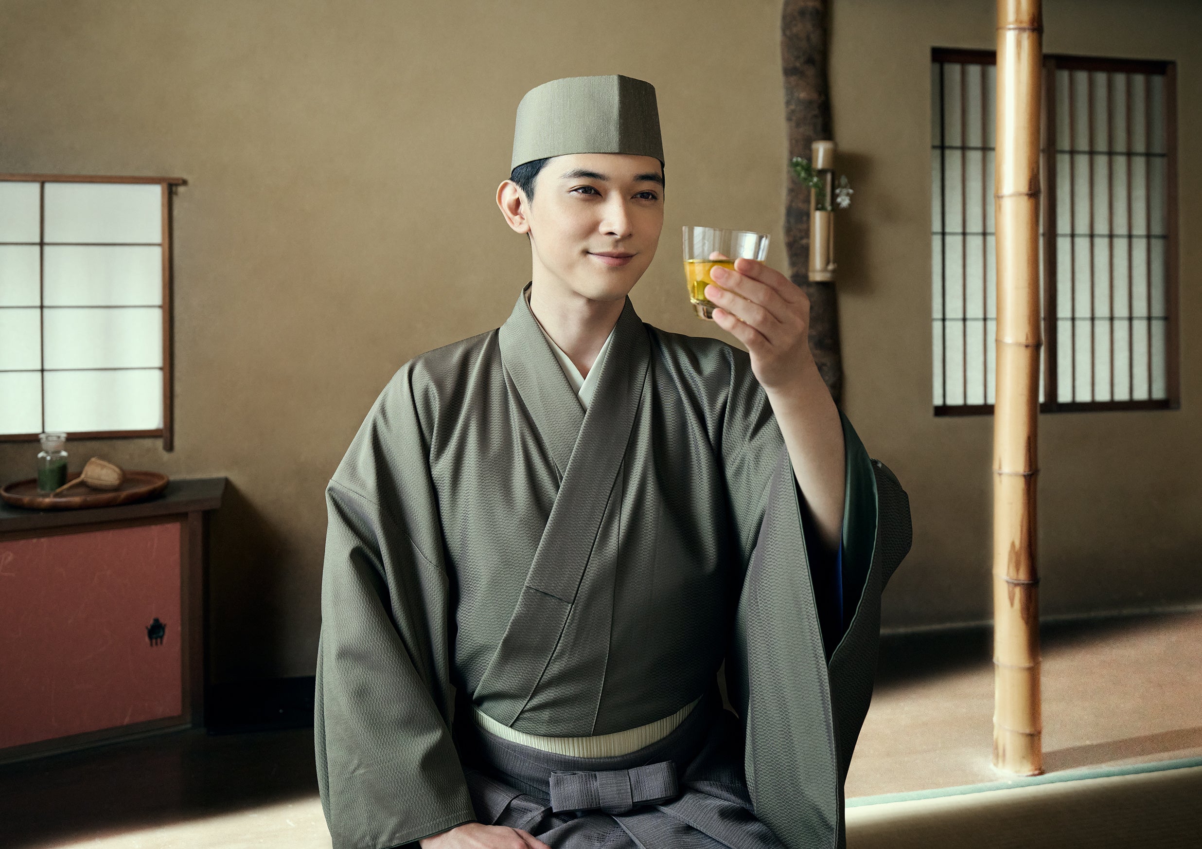 ブランドアンバサダー吉沢 亮さん演じる究極の茶道を追求する伝説の茶人「お綠さん(おりょくさん)」がひとり、理想のお茶を求めてひとり試飲を繰り返していた。そんな彼がふと朝の気配のなかで、心落ち着く、美しい瞬間に出会う。それがこの「綠」を飲んだ瞬間だった。まだ世界が動き出すほんの少し前の、美しい朝の気配。このお茶にはそれがあった。