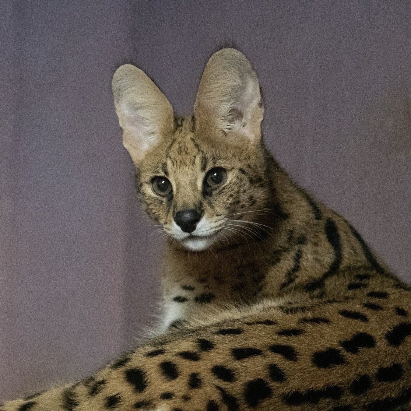 本企画展における目玉標本の一つであるサーバルの頭骨(長さ128ミリ、幅84ミリ、高さ59ミリ)は、2024年3月に7歳で生涯を閉じた雌の「ステル」のものです。サーバルは、テレビアニメ「けものフレンズ」で人気を集めたキャラクターの一つで、ステルも注目されました。