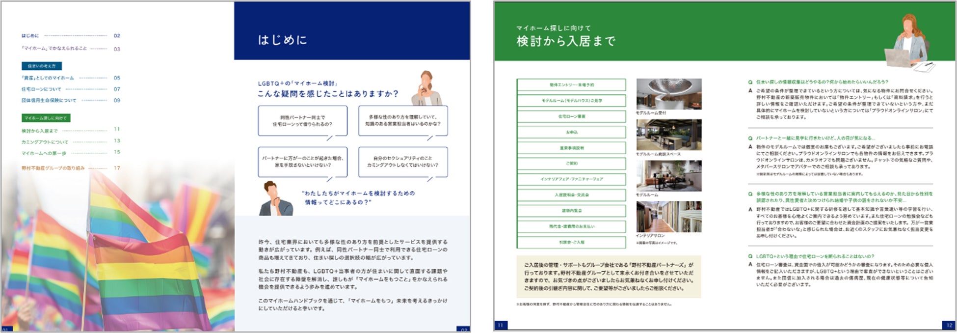 そのような中で、グループ各社からも独自の取組みが複数生まれており、野村不動産の住宅部門では2023年に、「ジェンダー平等・LGBTに関わるお客様対応ガイドライン」を策定し、全国のマンションの販売拠点にて導入、自発的に「アライチーム※2」を組成し、顧客サービスや風土醸成に活かす活動を行ってきました。本ハンドブックはアライチームでの取組みの一環であり、「LGBTQ+当事者の方が住まいに関して直面する課題や社会に存在する障壁を解消し、誰しもが自分らしい住まいを実現できる機会を提供したい」という思いから制作しました。「同性パートナー同士で住宅購入を検討するためには?」、「セクシュアリティのことをカミングアウトしなければならないの?」等、LGBTQ+当事者の方のマイホーム検討時における疑問を解消し、マイホームを持つ未来を考えるきっかけにしていただくためのものです。制作にあたっては、株式会社JobRainbow(本社:東京都千代田区/代表取締役CEO:星 賢人)の監修を受け、LGBTQ+当事者の方へのインタビューを行いながら、当事者の方たちがマイホームを持ちたいと考えた時に、まず手にとっていただけるハンドブックとなるように必要な情報をまとめ、このたび公開に至りました。