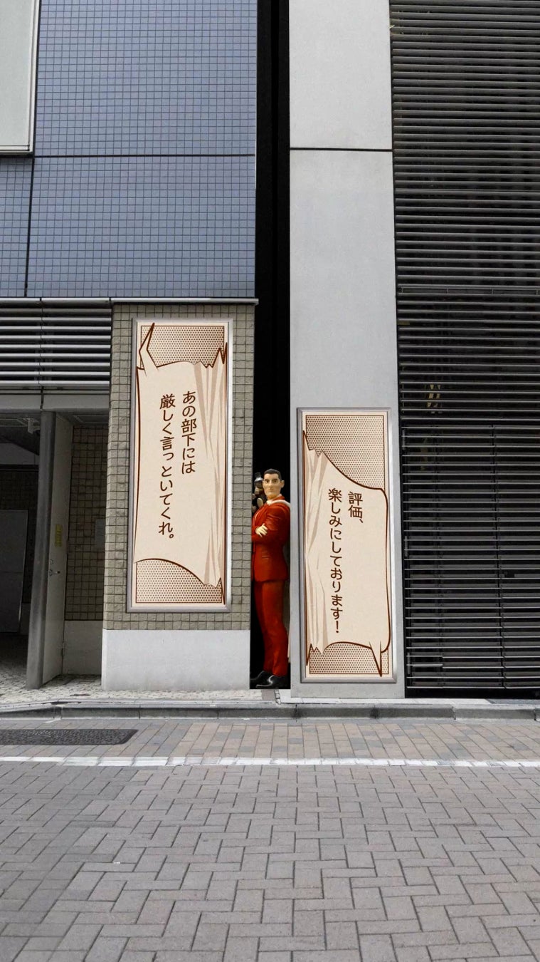 さらに、エレベーターの扉が開いた瞬間、上司と部下に挟まれながら必死に笑顔を保つ姿が現れることも。扉の開閉に合わせて「板挟まれ感」が変化する演出を通して、忙しい日常の中にヒーローが潜んでいるような感覚を、SNSを通じて楽しんでいただけます。