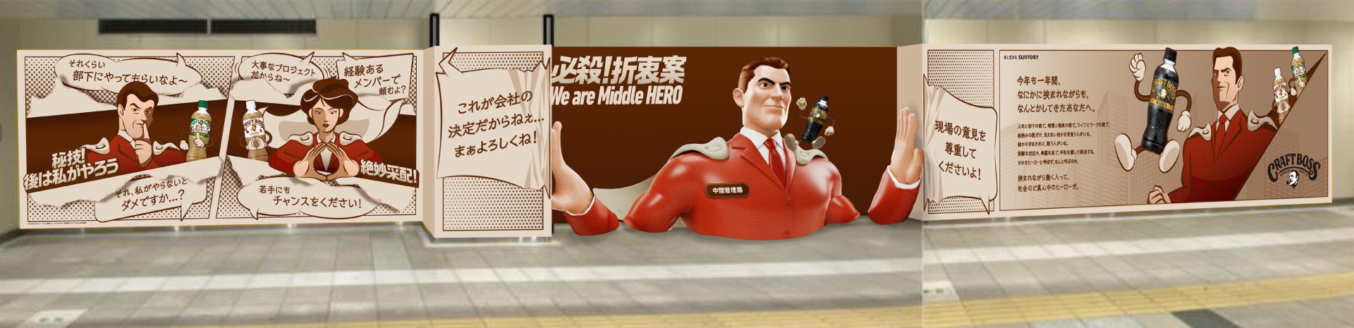 業務が円滑に回るように。みんなが気持ちよく働けるように。上司と部下の間、理想と現実の間、仕事とプライベートの間、さまざまな「間(はざま)」に挟まれ奮闘しながら働く人って、実は社会のど真ん中のヒーロー、すなわち「MIDDLE HERO」なのではないか。クラフトボスは、そんな“なにかに挟まれながら懸命に働く人”に着目し、「意外と身近な場所にこそ、ヒーローがいるんだ。」というメッセージと共に、この一年奮闘した「MIDDLE HERO」たちに心からのエールを送ります。