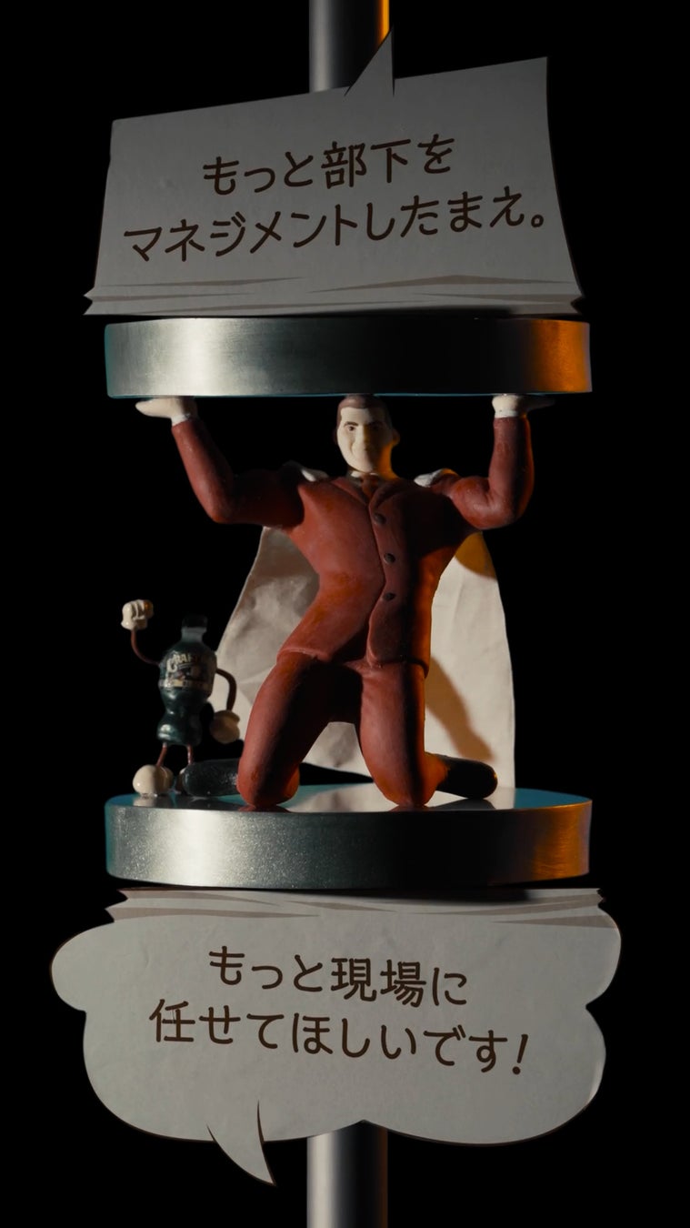 ビルの隙間に立つ、スーツの男性。目を凝らすと、上司や部下の視線を象徴したワードが出現し、彼がまさに板挟みのヒーロー「MIDDLE BOSS HERO」であることが明らかになります。