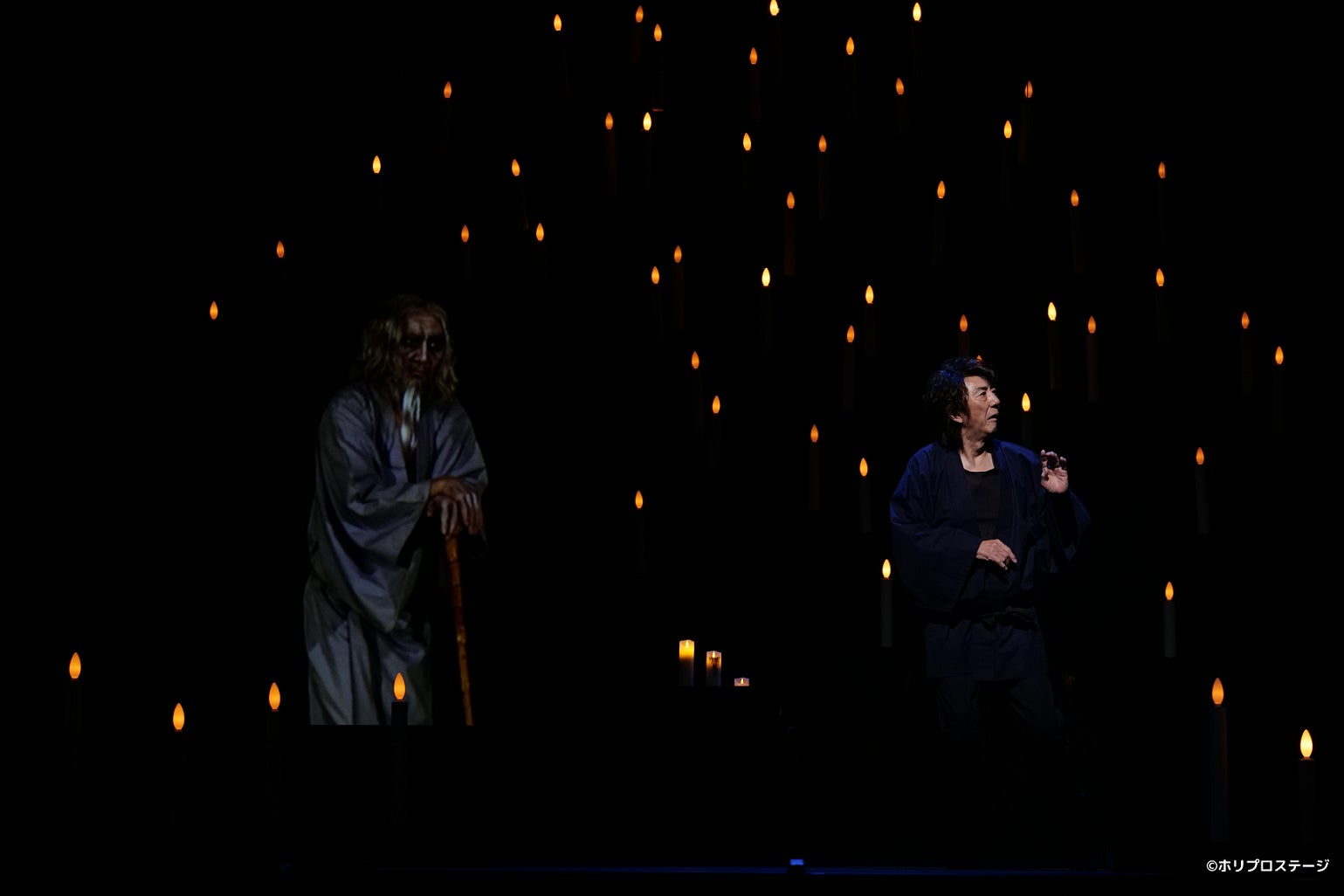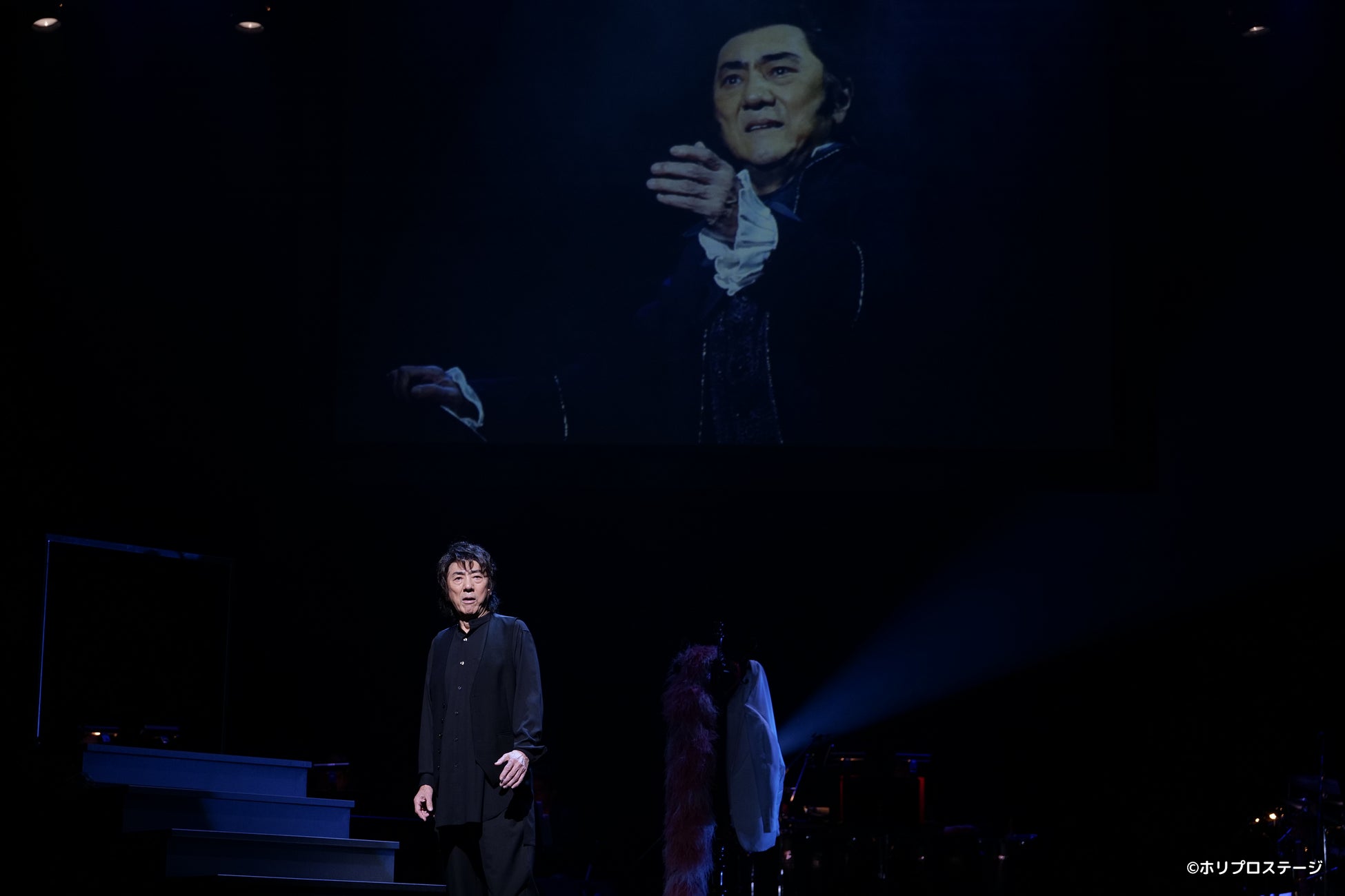 幕間を挟んで、「五十年間全作品人気楽曲披露」。なんと、市村が出演したミュージカル40曲以上、デビュー作「ヘロデ王の歌」(『イエス・キリスト=スーパースター』)から始まり、劇団四季時代から退団後の今に至るまでのナンバーを、思い出の画像やエピソードと共に披露するという。各曲ワンフレーズずつ歌う程度だろうと思っていたら、これが大違い。曲によってはガッツリ歌い切り、振付もつく。途中からこれは凄まじい挑戦だと気づき、楽しみながらも手に汗握って応援する気持ちになった。