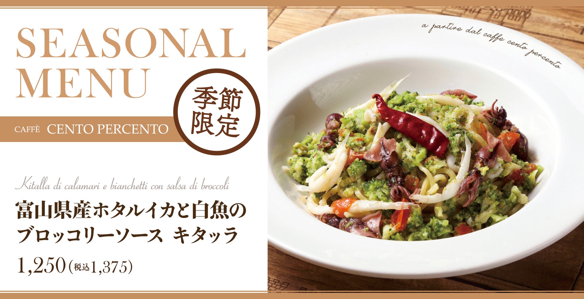 とんかつ専門店「かつや」などを展開するアークランドサービスホールディングス株式会社の子会社、フィルドテーブル株式会社(本社:東京都千代田区/代表:中島 宗則)は、ホームセンターを中心に出店し本格イタリアンを楽しめるカジュアルレストラン「チェントペルチェント」にて、春の新作「富山県産ホタルイカと白魚のブロッコリーソース キタッラ」と「北海道産生クリームのブディーノ」を2023年3月20日(月)より期間限定で販売開始いたします。