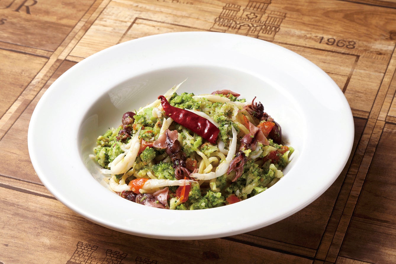 生のブロッコリーを柔らかく煮込んで仕立てた野菜たっぷりのソースに、⾓切りの中太の生パスタ「キタッラ」を合わせました。