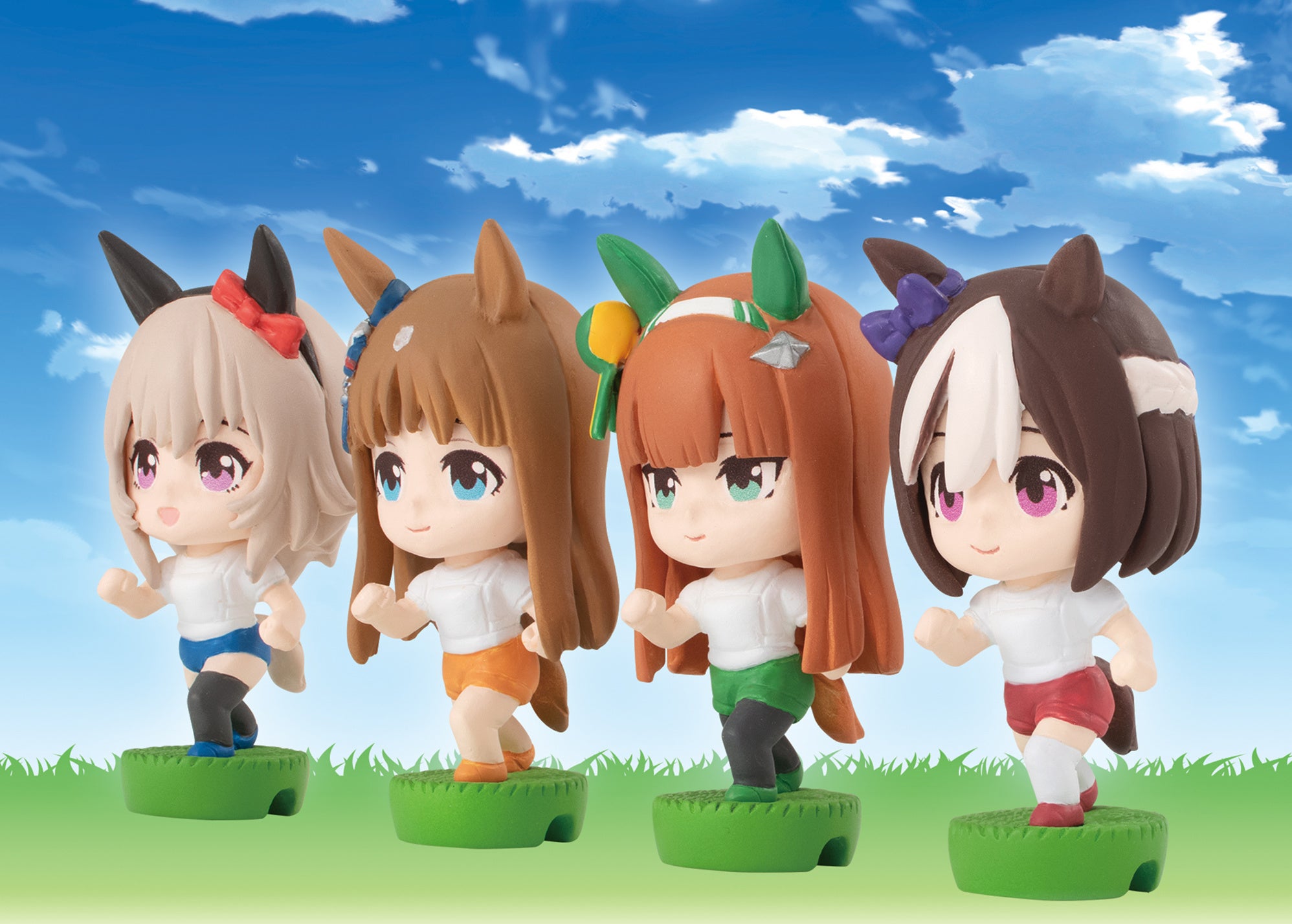 レース直前のゲート内での姿をイメージしたポージングで立体化。台座のスリットにコードを挟み込み横一列に並べることで出走直前のシーンを再現できます。