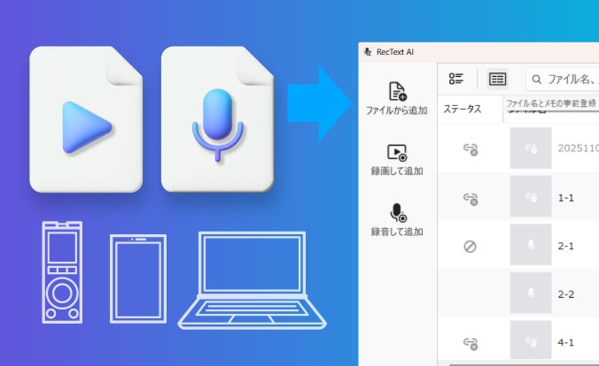 録音・録画済みのファイルを読み込んで、複数ファイルをまとめて取り込めるようになりました。ボイスレコーダーやスマートフォンで録音したファイル形式にも対応。対応形式をm4aに拡大し、さらに幅広いファイルを取り扱えるようになりました。