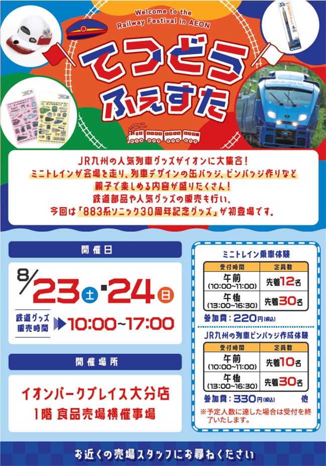イオン九州株式会社とJR九州商事株式会社では、イオンパークプレイス大分店にてイベント「イオン鉄道フェスタ」を開催します。ミニトレイン乗車体験やピンバッジ作成体験の他、選りすぐりの鉄道グッズや実際に使用されていた鉄道部品の販売も行います。また、地元大分ゆかりの特急883系ソニック30周年を記念したグッズも発売いたします。なお、イベント期間終了後も、お気軽にJR九州の鉄道グッズをお買い求めいただけるよう、同店舗においては、鉄道グッズを継続して販売いたします。