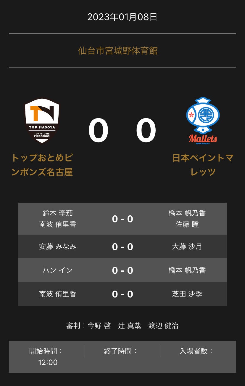 ノジマTリーグ 2022-2023シーズン 公式戦 1月8日開催 トップおとめピンポンズ名古屋 vs 日本ペイントマレッツ オーダー発表