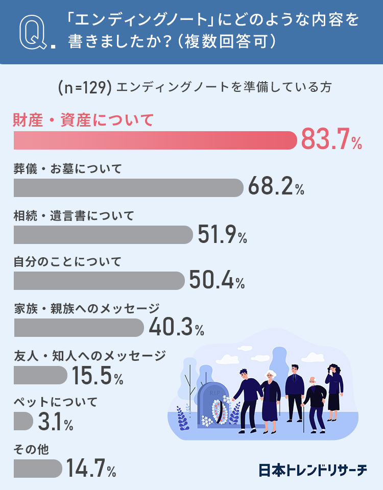 エンディングノートの内容としては、財産や資産についてが83.7%と最も多い結果となりました。