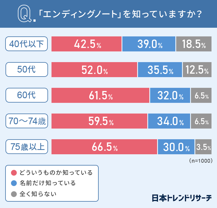 全国の男女1000名のうち、50代以上の半数がエンディングノートが「どういうものなのか知っている」と答えました。
