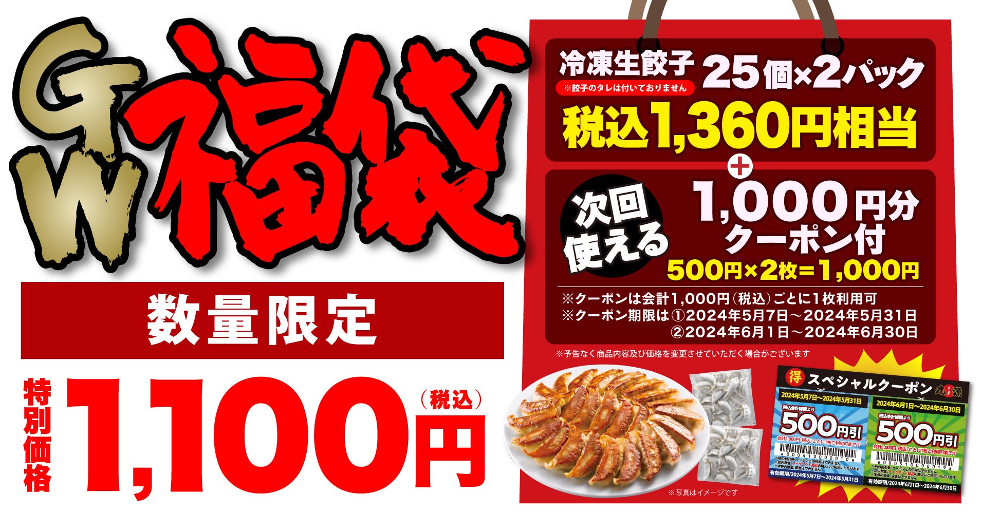 株式会社物語コーポレーション(本社:愛知県豊橋市/代表取締役社長:加藤 央之)が全国206店舗展開中の『丸源ラーメン』は、2024年4月27日(土)〜2024年5月6日(月)の期間限定で、冷凍生餃子50個とお得な限定クーポン2枚(1,000円分)がセットになった「丸源GW福袋」を1,100円(税込)で店頭販売いたします。当日販売分を毎日数量限定でご用意しております。