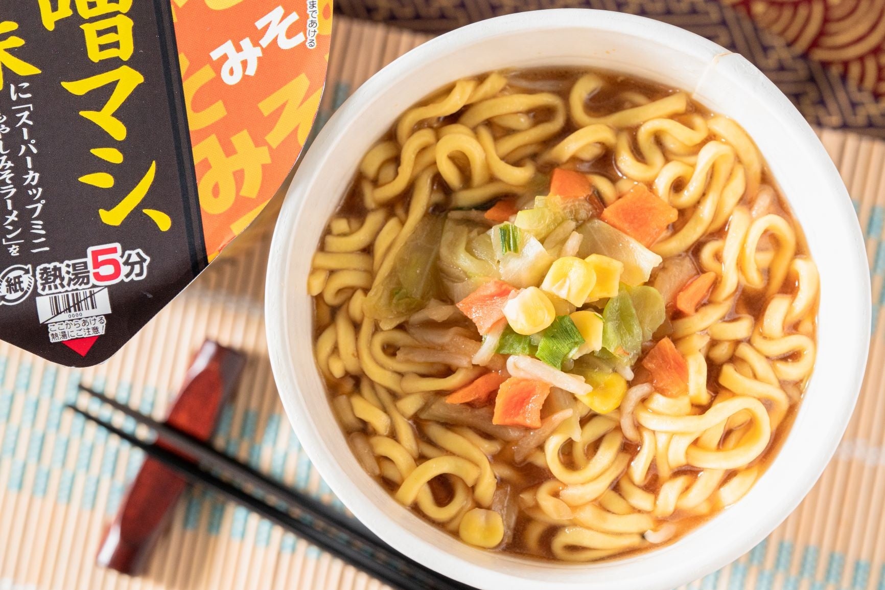 【内容】2種類の液体スープ(※)によって濃厚な味噌の風味が楽しめるカップ麺です。具材には、味噌ラーメンのスープの味と相性によく合う5種類の野菜(もやし、キャベツ、コーン、人参、ねぎ)が入っています。