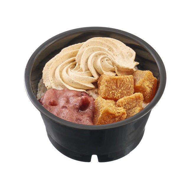 黒蜜を染み込ませたスポンジに、黒糖入りムースと黒糖入りホイップを合わせました。黒糖味のわらび餅、粒あんと一緒にお楽しみください。