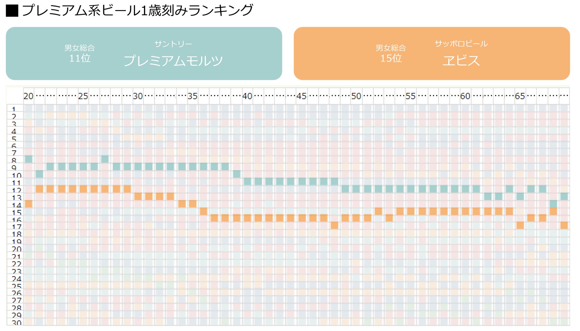 続いて、通常の商品よりもこだわった原料や製法により、プレミアム系に分類される高級志向なプレミアムビールのブランドの年齢別購買ランキングを読み解きます。年齢別購買ランキングの推移を見てみると、意外にも生活に比較的余裕のある高年齢層からではなく、20・30代の若年層に人気が高いことがわかりました。