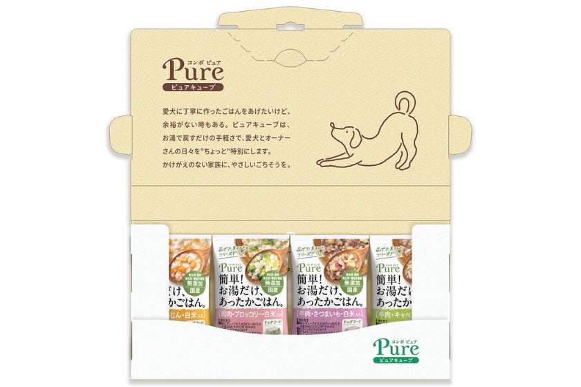 日本で初めて国産のドッグフードの販売を開始した日本ペットフード株式会社から、公式オンラインショップ限定販売の新商品「ピュアキューブ」が5月1日より発売!愛犬にあたたかい手作りごはんを作ってあげたいけど、時間のゆとりがない…そんなわんちゃんオーナーさんのために生まれた、素材を“洗う・切る・ゆでる”手間なく、お湯を注いでたったの15秒で手作り風ごはんが作れるフリーズドライタイプのウェットフードです。野菜のスペシャリストである農家さんが厳選した野菜を使用し、栄養や旨みをぎゅっと閉じ込めてフリーズドライにすることで豊かな香りや味を感じられる商品となっております。