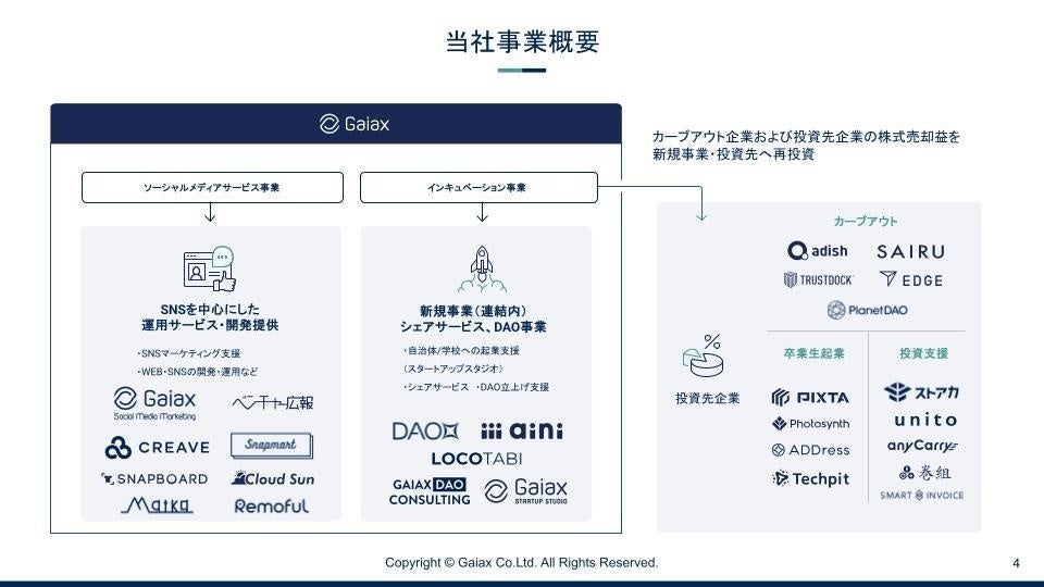 事業内容:ソーシャルメディアサービス事業、シェアリングエコノミー事業、web3/DAO事業、インキュベーション事業