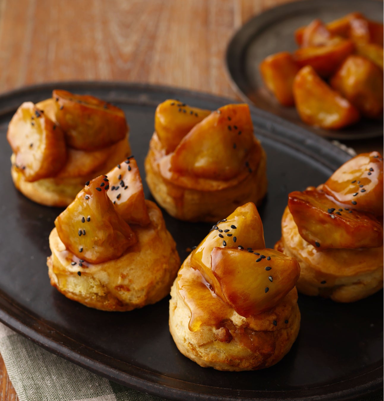 焼き芋を練りこみほくっと焼き上げたスコーンに、甘じょっぱい蜜がからんだ大学芋をトッピング。