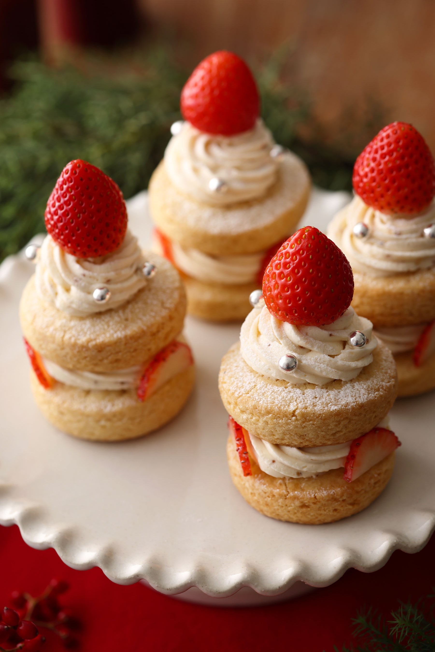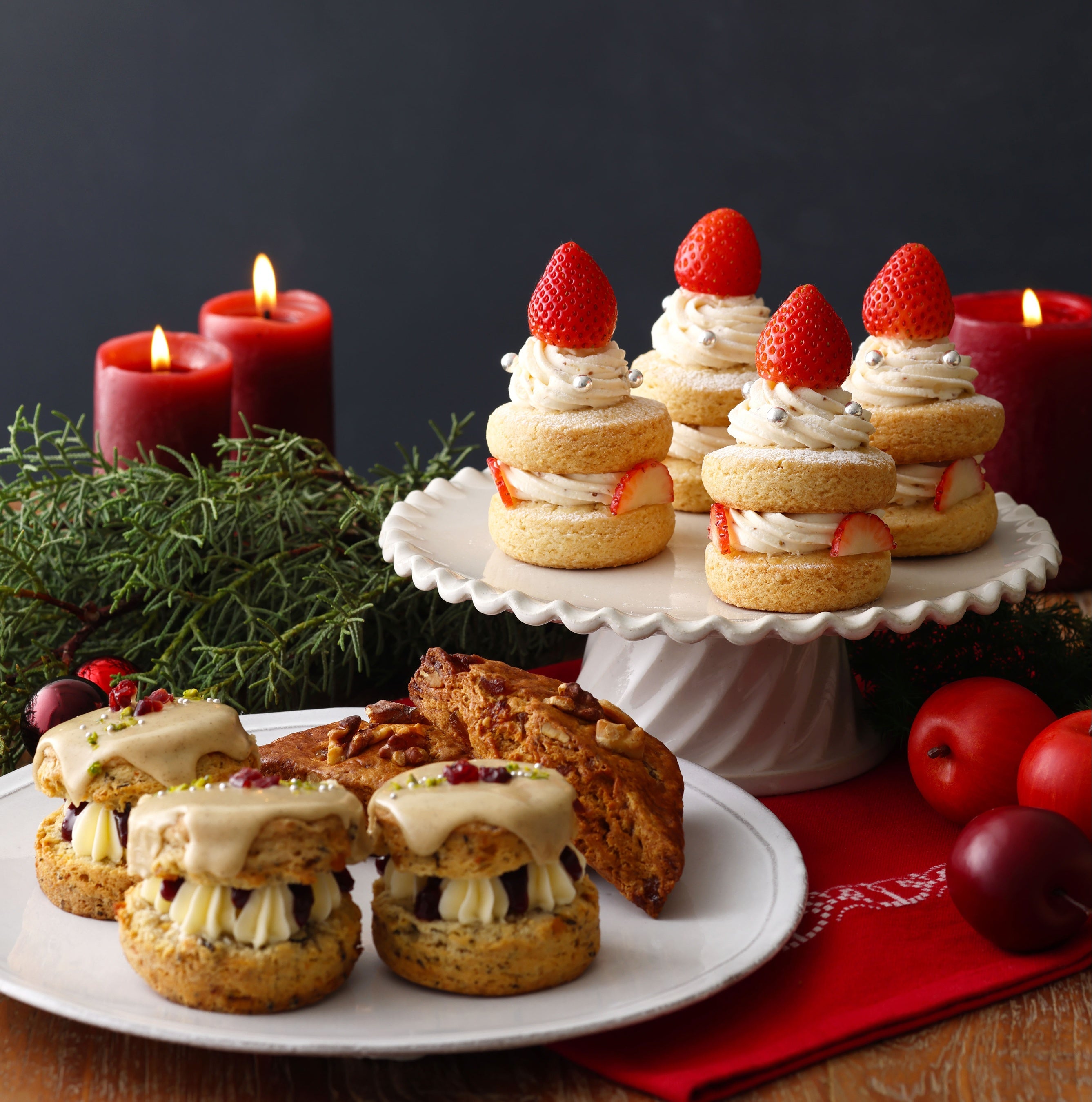 発酵バターを使用した特製あまおう苺バタークリームをサクほろ食感のスコーンでサンドし、ロウソクの炎に見立ててフレッシュ苺をのせたクリスマスのスペシャルスコーンサンド。今年は、スコーン生地の配合をリニューアルし、サクほろ食感に。より美味しくなりました!
