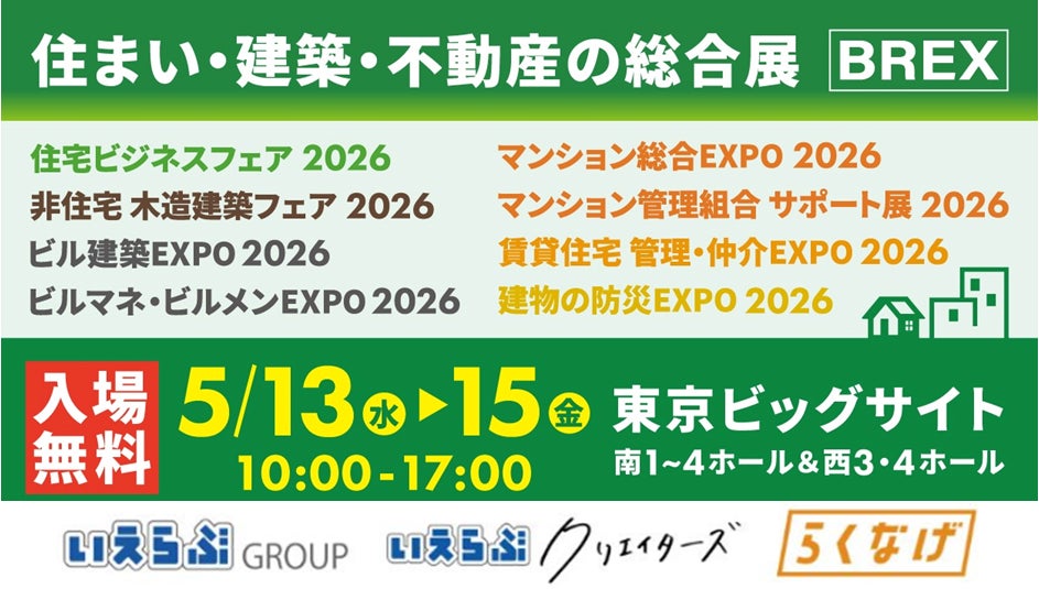 「住まい・建築・不動産の総合展【BREX】賃貸住宅 管理・仲介EXPO 2026/不動産売買ゾーン」にいえらぶGROUP、いえらぶクリエイターズ、らくなげが出展!5/13(水)~15(金)の3日間開催