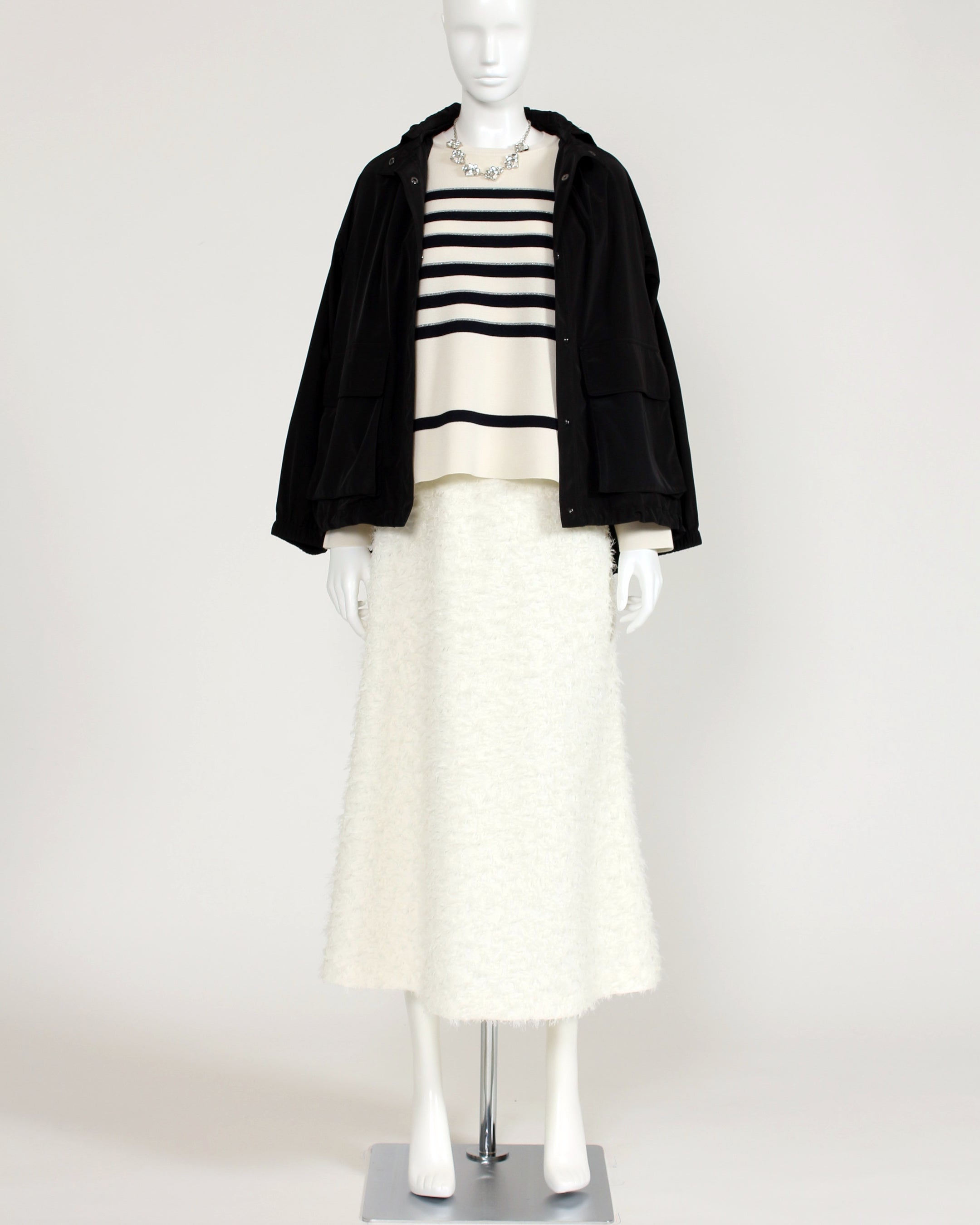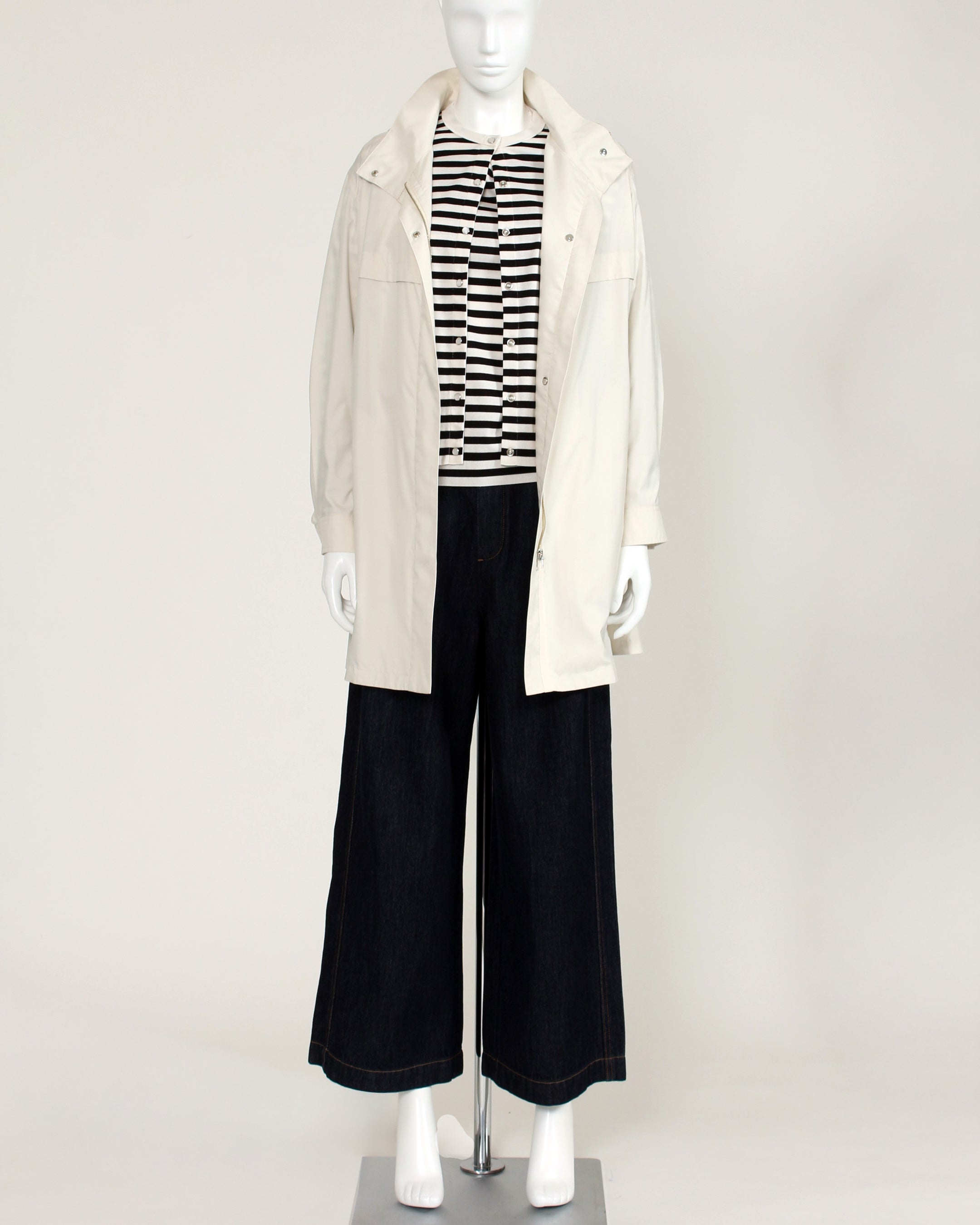 花粉プロテクト機能とはっ水機能を持つ素材です。フードを取り外すとシンプルなスタンドカラーコートになるデザインです。背中部分にはメッシュ素材を採用。通気性があり、梅雨時期も快適に着用できます。テントラインのシルエットがポイントです。