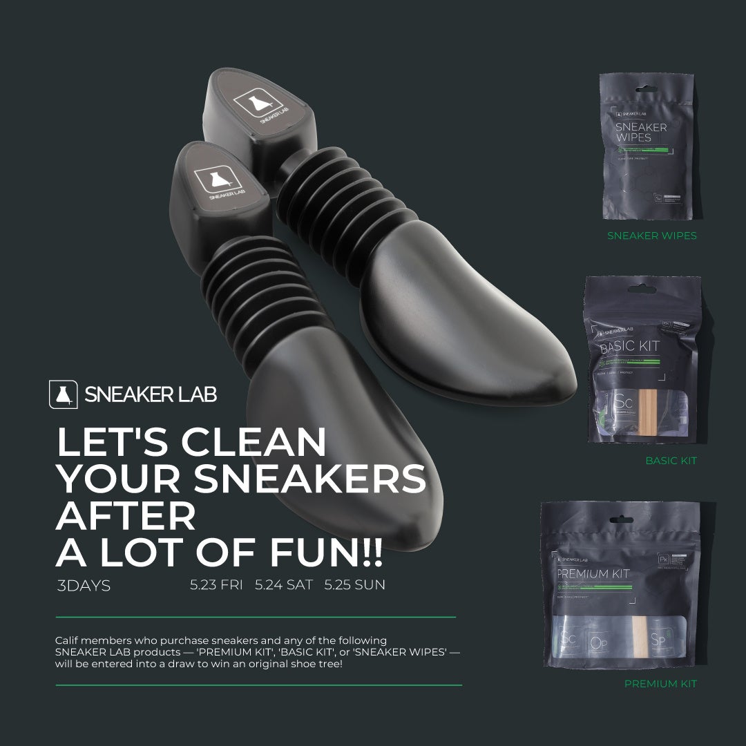 5/23(金)・24(土)・25(日)の3日間限定 Styles Annexにてcalif会員の方でスニーカーとSNEAKER LAB「PREMIUM KIT」「BASIC KIT」「SNEAKER WIPES」のいずれかをご購入いただくと抽選でオリジナルシューキーパーをプレゼントいたします。