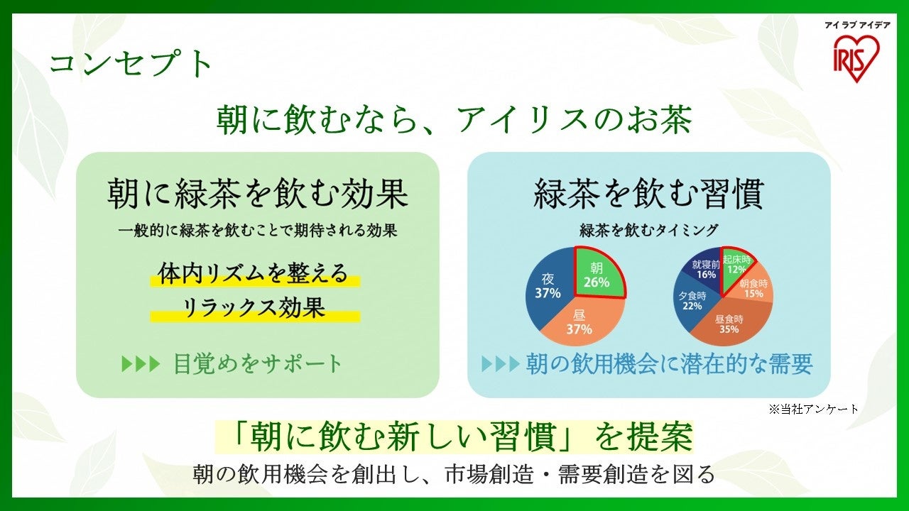 一般的に、緑茶は朝に飲むことで目覚めを良くし、リラックス効果をもたらすとされています。しかし、当社が実施したアンケート調査結果(※3)では、緑茶を飲む場面として、「朝・起床時」と回答した割合が「昼・夜・就寝前」などと比較して少ない結果となりました。こうした実態を踏まえ、当社は「朝に飲むなら、アイリスのお茶」という新たなコンセプトを掲げ、渋みや苦みが少なく甘みのある味わいの“朝に合う緑茶”「アイリスのお茶 綠」を通じて、新たな市場と需要の創造を図ります。