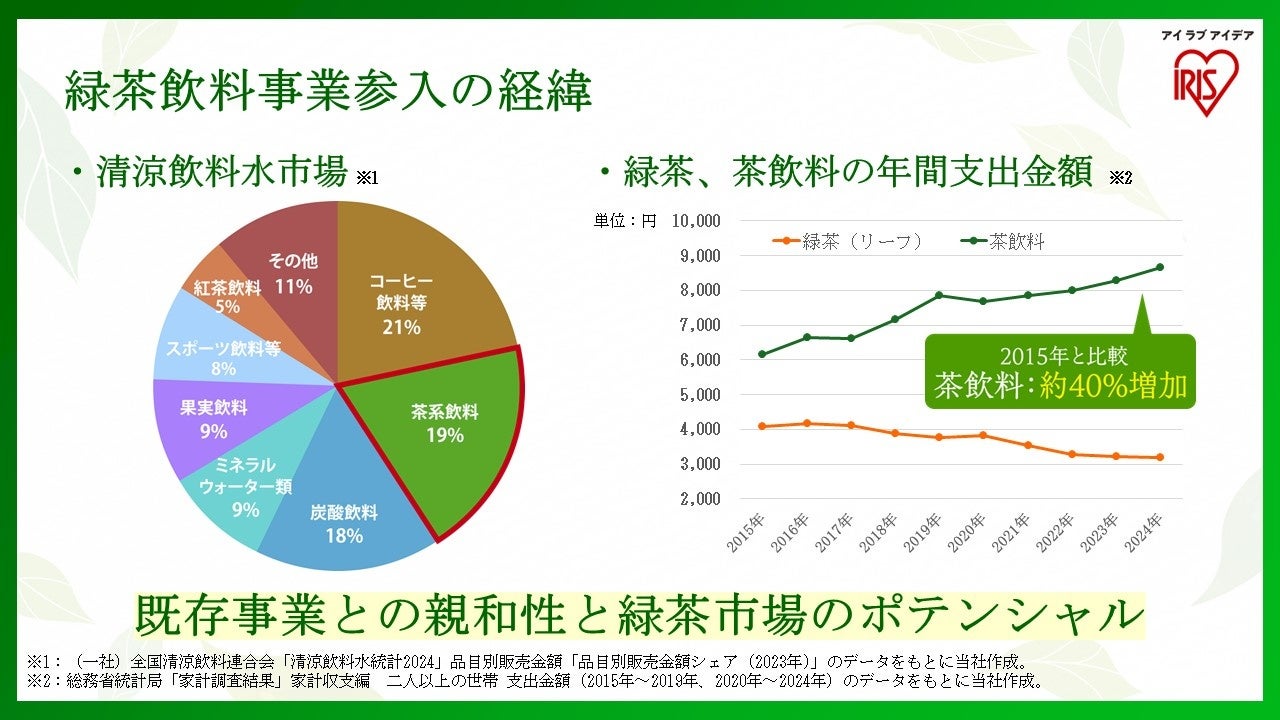 現在の清涼飲料水市場において、茶系飲料はコーヒー飲料等に次ぐ2番目のシェア(※1)を占めており、茶飲料の年間支出額も2015年と比較して約40%増加(※2)するなど、今後も成長が期待される市場です。このような市場動向をふまえ、当社は飲料水事業のさらなる拡大を目指し、緑茶市場に新規参入することを決定しました。