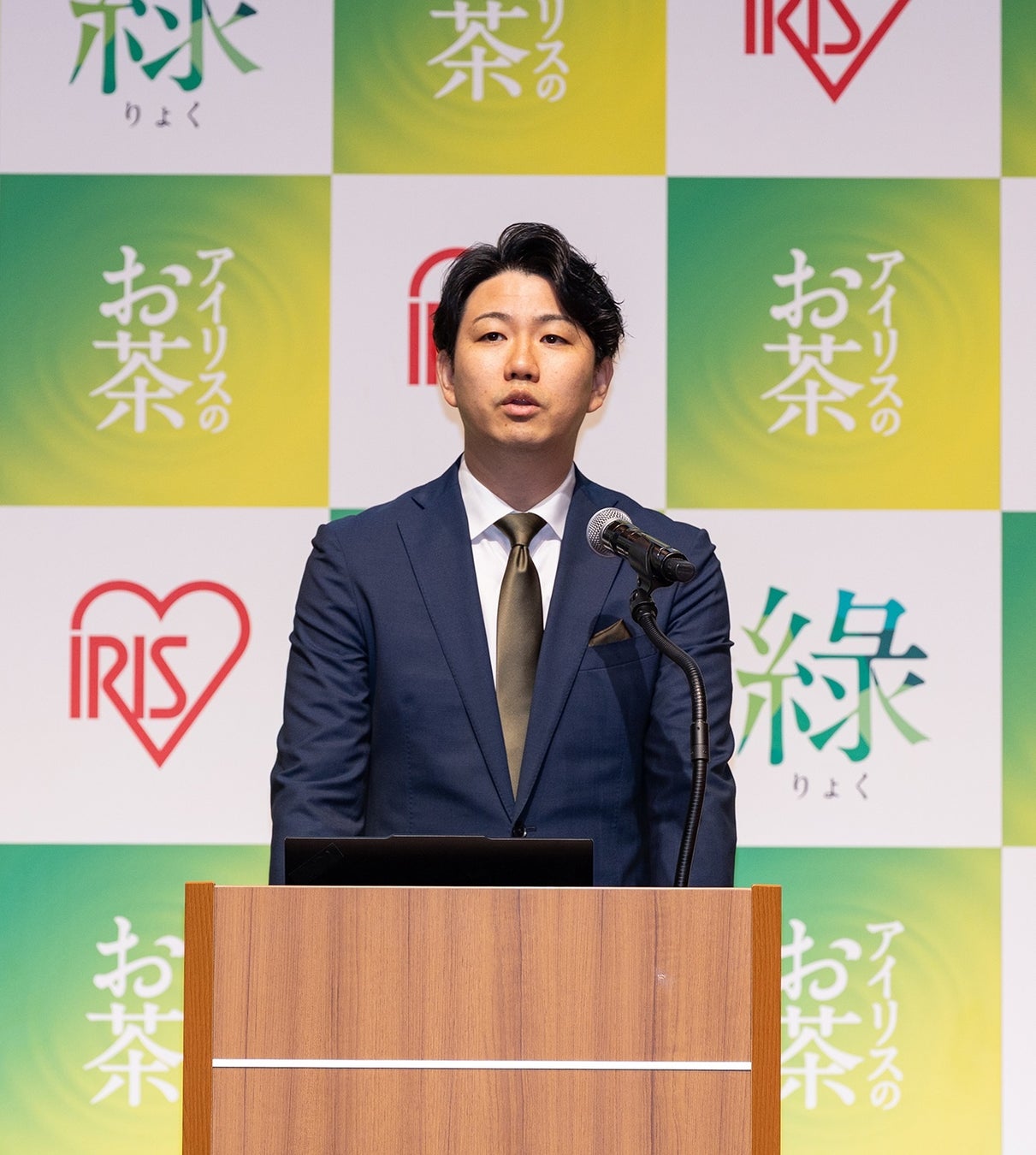 発表会の冒頭では、当社執行役員 勝間 浩之が登壇し、主催挨拶とともに、“朝に飲む新しい習慣”を提案する新商品「アイリスのお茶 綠」について説明しました。