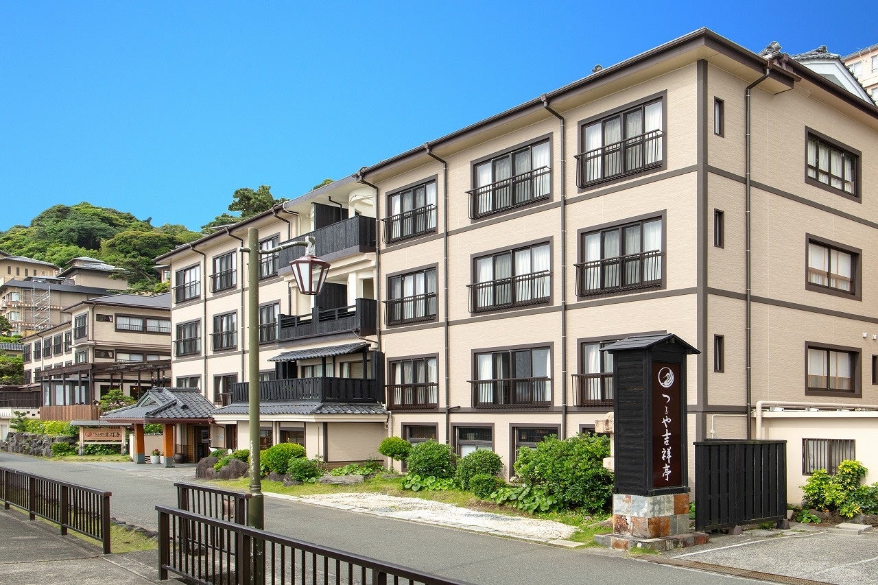 どこか懐かしい静かな港町、北川温泉の海沿いに佇み、目の前に海と伊豆大島のパノラマが広がる和の湯宿。