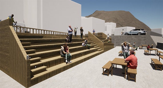 広場へ繋がるスロープは、車椅子でもアクセス可能なユニバーサルデザイン。誰もがのんびりと海を眺めながらひと休みできる憩いのテラスです。