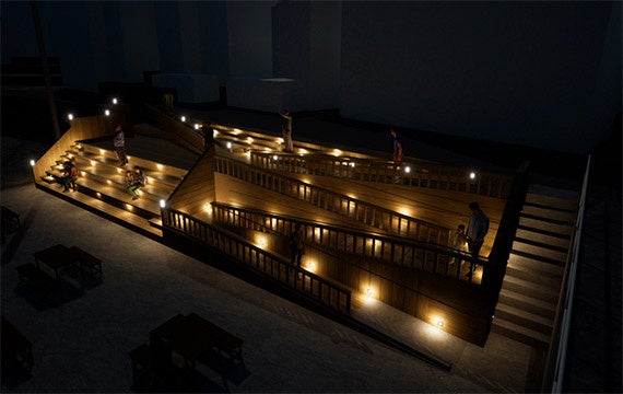 当館から海沿いに徒歩約3分、北川(ほっかわ)温泉の漁港にある「ねこさい広場」に、2023年11月「ムーンロードテラス」が完成しました。階段状のデッキは、さながら屋外シアターの観客席。