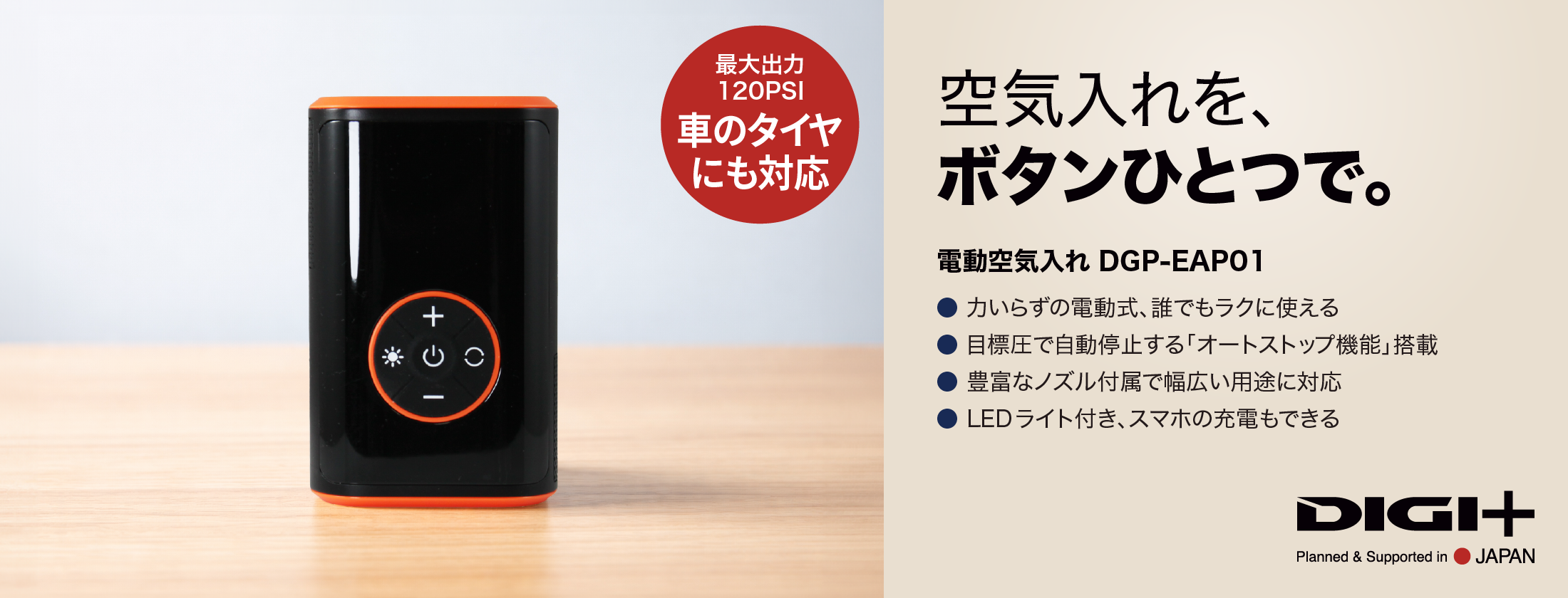 製品名、価格:「DIGI+ DGP-EAP01 電動空気入れ」 (6,980円・税込)