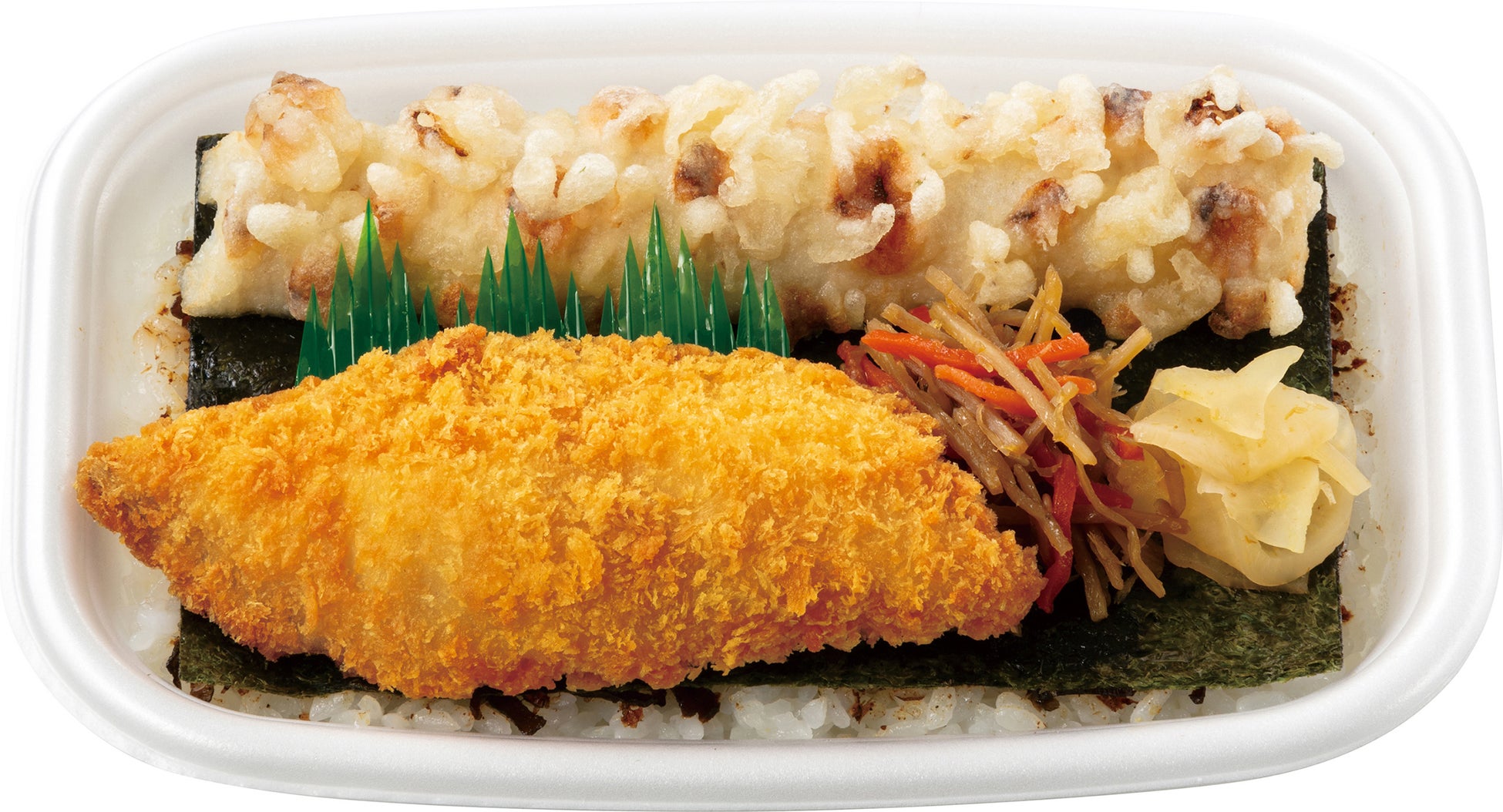 ごはんの上におかか昆布とのりをのせ、衣はサクサク、身はホクホクの白身魚のフライと食べ応えたっぷりのちくわ天を盛り付けました。