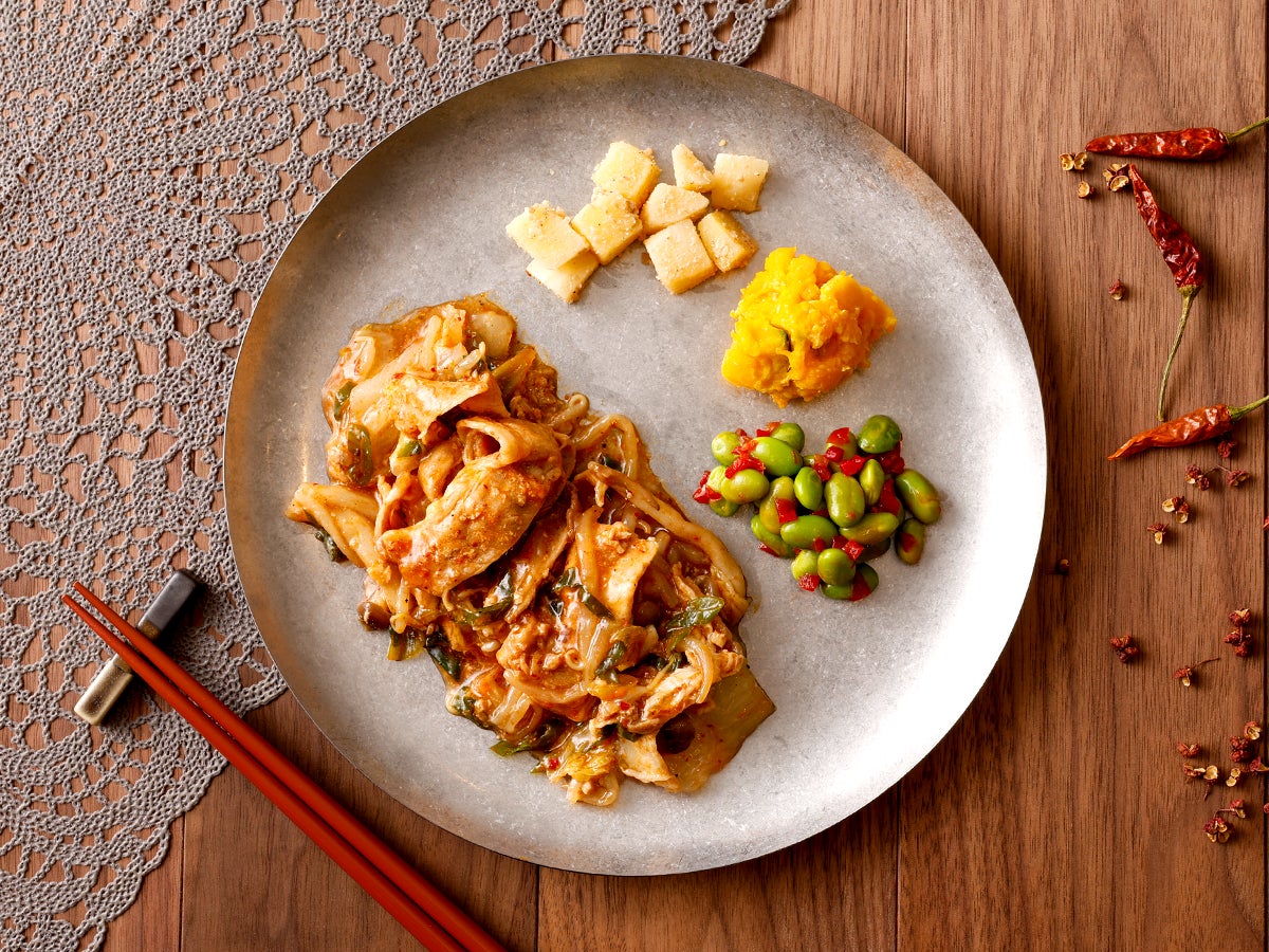 今回新登場する「シビれる旨辛!豚バラの麻辣仕立て」は、辛いもの好きの方にはたまらない、本格的な麻辣が味わえる一品です。メインとなるのは、甘辛く仕上げたジューシーな豚バラ肉と、風味豊かなニンニクもやし。そこに花椒の爽やかなシビれと、唐辛子の鋭い辛さを効かせた「特製麻辣ソース」をたっぷりと合わせました。具材の下には白菜としめじを敷き詰め、野菜の甘みと食感のコントラストをプラス。濃厚なソースを具材全体によく絡めてお召し上がりください。