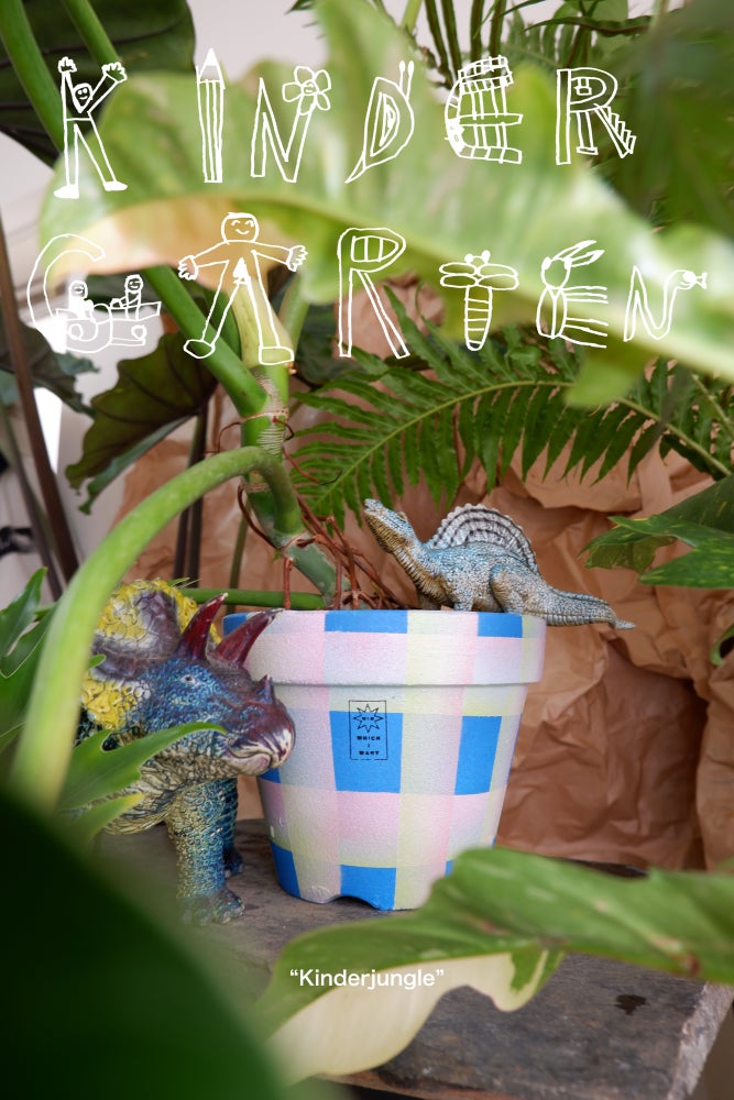 「Kinderjungle」と題した本展では、展示空間をジャングルに見立て、約30点の鉢植え植物を展示・販売します。ジャングルを彷彿とさせるような植物のセレクトと、Kindergartenらしいポップな鉢植えの組み合わせをお楽しみください。