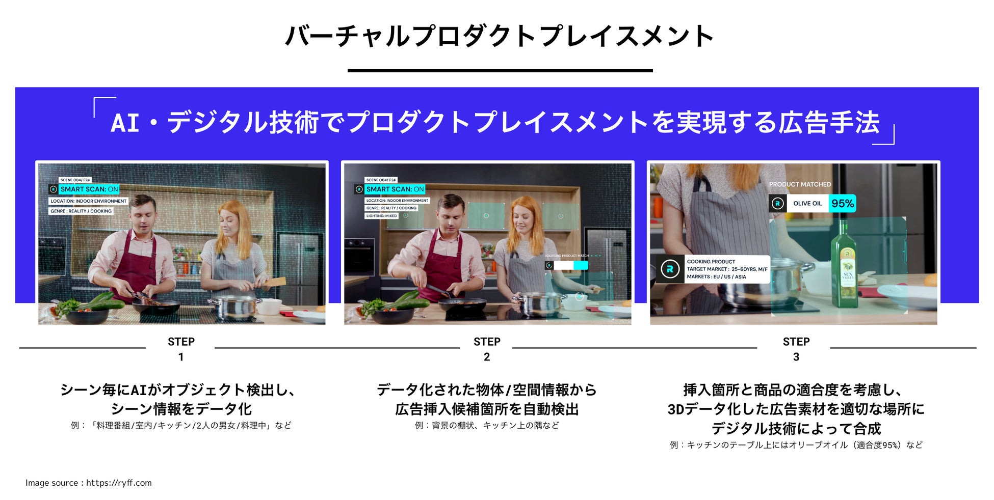 VPPでは、既に収録された番組内の登場人物やシチュエーションなどをAI技術によって解析し、どのようなブランド商品を・どのような形状で・どのように配置できるかを可視化します。ブランド広告主やコンテンツプロバイダーはそれらの情報から、番組内でどこに配置するかを後から決めることができるという点が、VPPのメリットや大きな特徴であると言えます。