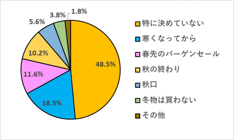 「冬物アウターを購入するタイミングはいつですか?」の質問については、「特に決めていない」が48.5%、次いで「寒くなってから」が18.5%、「春先のバーゲンセール」が11.6%という順になりました。特にいつ買うかを決めていない方が多いようです。