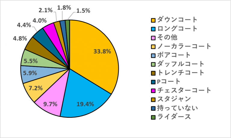 「よく着る冬物アウターのタイプは何ですか?」の質問に対し、「ダウンコート」が33.8%、「ロングコート」が19.4%、「その他」が9.7%という順になりました。暖かいダウンコートを着ている方が多いようですね。